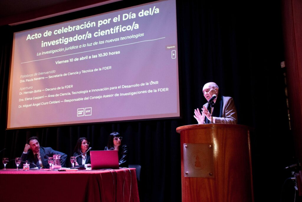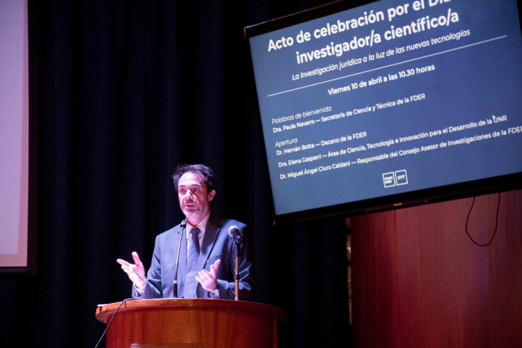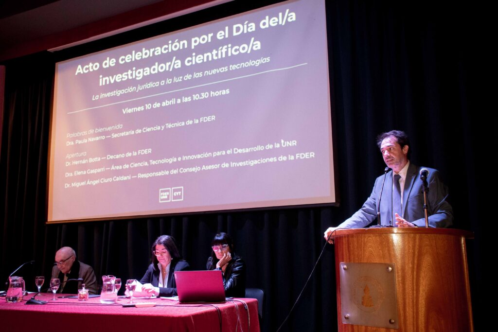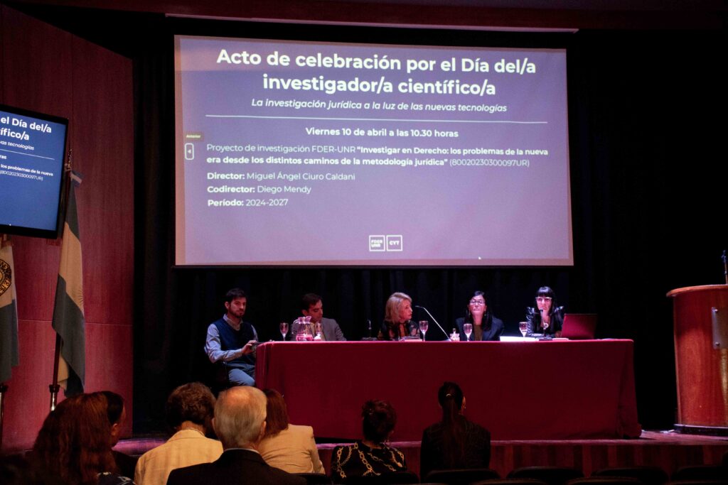 El pasado viernes 10 de abril, la Facultad de Derecho de la UNR celebró el Día del/la Investigador/a Científico/a con el panel central: “La investigación jurídica a la luz de las nuevas tecnologías”. El encuentro, realizado en el Aula Magna, contó con la presencia de autoridades, docentes y destacados miembros de la comunidad científico-tecnológica de la institución.